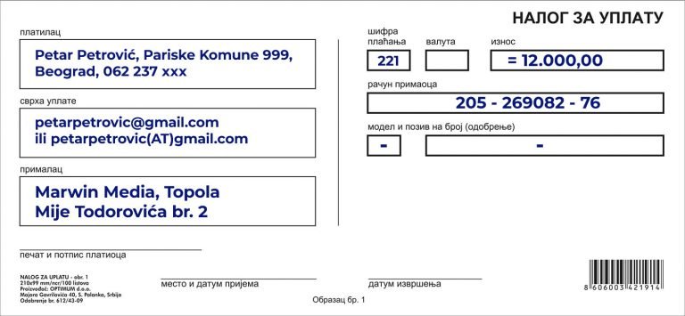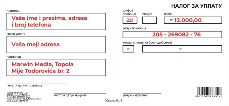 Za sve vas koji ste fizička lica iz Srbije, plaćanje se vrši na račun firme Marwin Media. Možete platiti uplatnicom u banci ili pošti, a moja preporuka je eBanking ili mBanking. U nastavku ćete videti podatke za uplatu, primer uplatnice i najvažnije informacije.